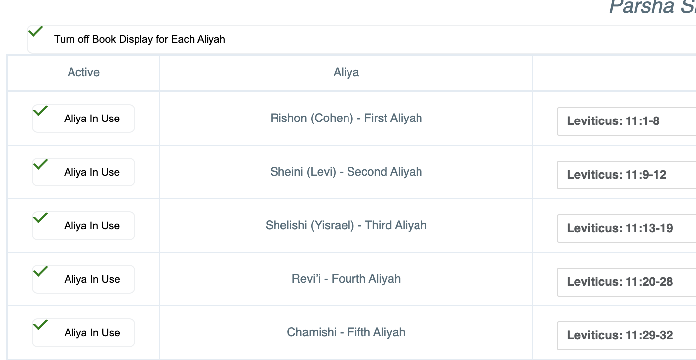 We added a new link in the Admin menu to enable quick access to the calendar, you can also directly access the calendar from the regular Parsha Management page. Once you select the Parasha from the calendar the program will behave exactly as it has in the past and you will be able to add and remove aliyot as required, edit the Parasha definition and assign people. This implementation uses hebcals perpetual calendar APIs in order to pull the correct definition from their web services.