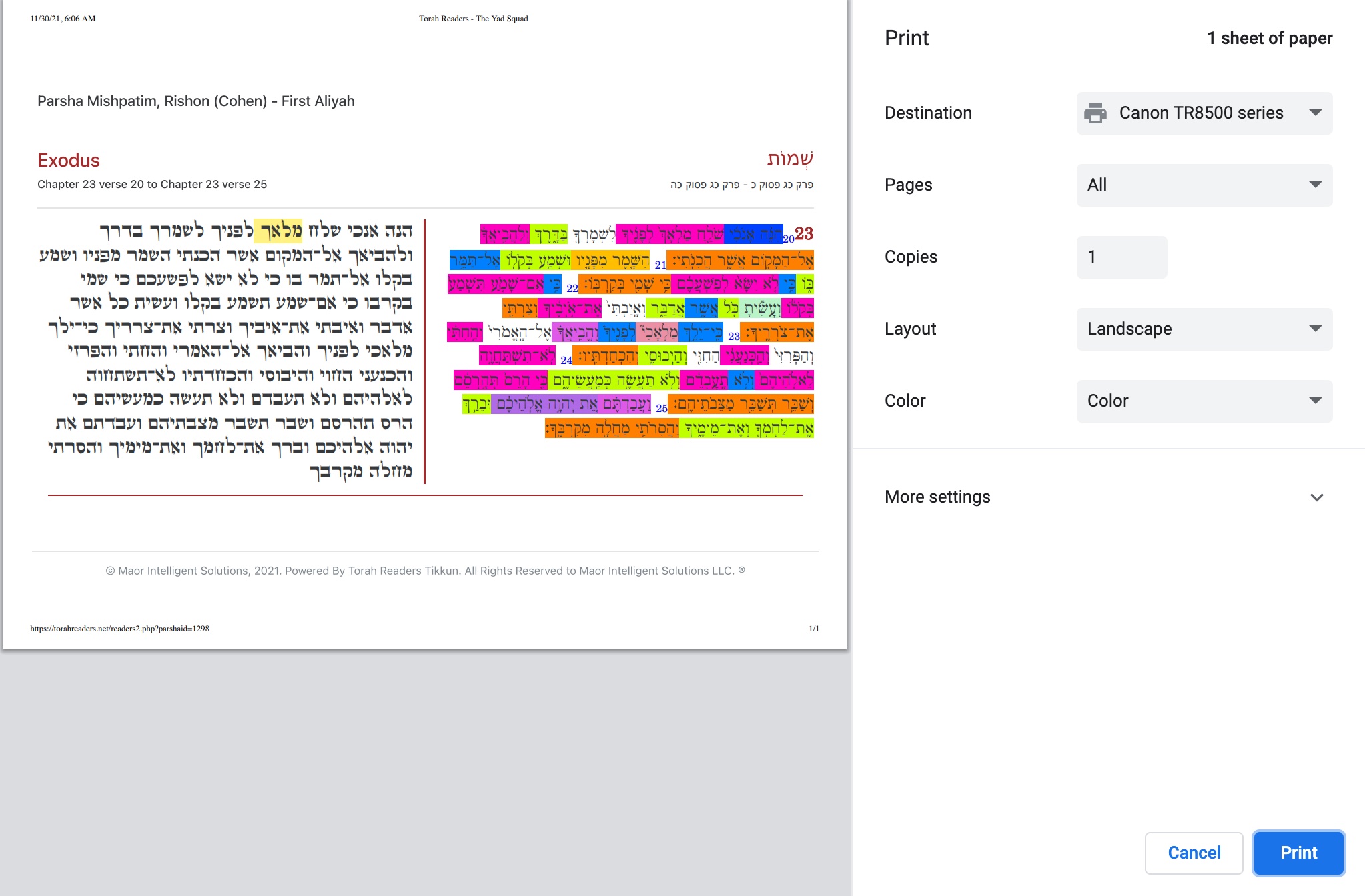 We have enhanced the Tikkun Print Preview to include colors and a side-by-side representation in-line with the standard Tikkun. The page has been formatted to fit both potrait and landscape orientations of the paper even though landscape is the prefered printing option.