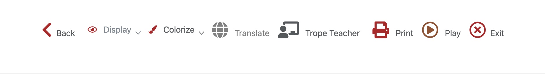 Where available the Translation to English can be displayed from the Translate button. The Trope Teacher is a function that enables you to focus on a specific Trope pattern and listen to the sounds that the pattern makes. This works as a Toggle button. When Trope Teacher is turned on, clickin on any word in the text will load a view of the text and play the associated pattern.