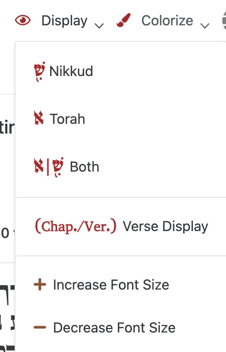We have added several new functions to help highlight various parts of the text. From the "Colorize" menu, users can now highlight the Trope patters in the text, Highlight just the vowles, or highlight just the notes/Ta'amim/Trope.